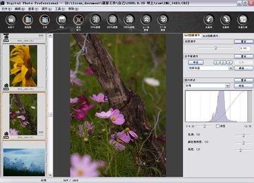 Digital Photo Professional的啟動(dòng)相當(dāng)迅速,和其他幾款RAW處理軟件相比優(yōu)勢明顯。缺省狀態(tài)下,Digital Photo Professional采用“文件樹(左)+縮略圖(右)”的組織結(jié)構(gòu),頂部是工具按鍵欄和菜單欄。