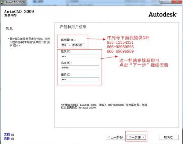 輸入CAD2009 32/64位中文版的序列號(“653-12354321”“666-98989898”“666-69696969”)這三個序列號任選其一即可 用戶信息自己隨意填寫即可 點擊“下一步”繼續(xù)