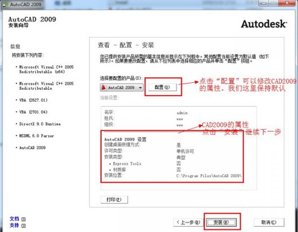 點擊“配置”可以修改CAD2009 32/64位中文版的配置 確定后點擊“安裝”開始安裝CAD2009