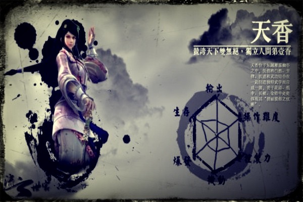天香位于東越雁蕩幽谷之中,憑借將自然、音律、醫(yī)道和武功結(jié)合在一起創(chuàng)造獨(dú)特武學(xué)而自成一派,更于紙傘、長(zhǎng)裙、金鈴中處處體現(xiàn)其“清麗脫俗之優(yōu)雅”。(尚未出現(xiàn))