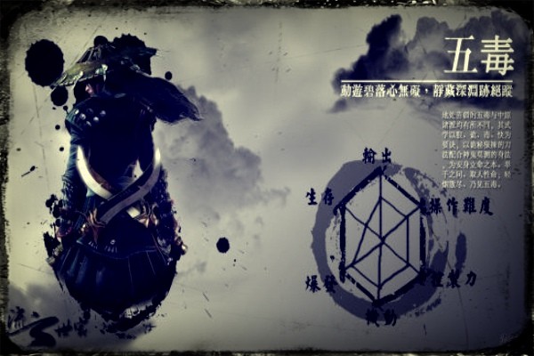 地處苗疆的五毒與中原諸派均有所不同,其武學(xué)以狠、詭、毒、快為要訣,以詭秘狠辣的刀法配合神鬼莫測(cè)的身法,為安身立命之本。舉手之間、取人性命;輕煙散盡、乃見五毒。(尚未出現(xiàn))