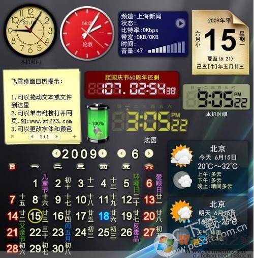 2.更好的視覺體驗。月歷、日歷、時鐘、便簽、網(wǎng)絡(luò)電臺等均至少能調(diào)配出16581375種色彩搭配,并最先采用分層透明度調(diào)節(jié),確保與桌面背景良好的融合。
