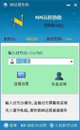 NN遠(yuǎn)程協(xié)助軟件是一款簡單好用的遠(yuǎn)程控制軟件。使用這款NN遠(yuǎn)程協(xié)助軟件的前提是需要雙方電腦都要安裝這款軟件,在雙方電腦都打開該軟件之后通過分配的id連接,連接以后我們就可以進(jìn)行遠(yuǎn)程控制,以及發(fā)送消息、截屏等等操作了。這款軟件非常的安全,不支持后臺隱藏運行也不支持開機運行(若需要開機運行請安裝加速服務(wù)),有需要進(jìn)行遠(yuǎn)程控制的用戶快來試試NN遠(yuǎn)程協(xié)助軟件吧!