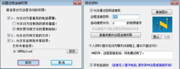可設(shè)置遠(yuǎn)程權(quán)限(是否允許控制電腦,允許下載文件等),可設(shè)置是否允許通過密碼連接自己(注冊帳號可設(shè)置密碼)。