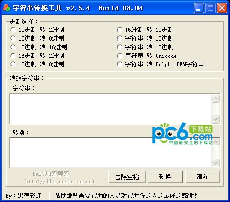 字符串轉(zhuǎn)換工具是一款綠色安裝轉(zhuǎn)換速度飛快的進(jìn)制選擇轉(zhuǎn)換器,使用這款字符轉(zhuǎn)換器能夠保持文字到字節(jié)數(shù)集、字節(jié)數(shù)可以集到文字集中間的互相變換,內(nèi)含多種轉(zhuǎn)換工具,如10進(jìn)制轉(zhuǎn)2進(jìn)制,16進(jìn)制轉(zhuǎn)10進(jìn)制,10進(jìn)制轉(zhuǎn)16進(jìn)制,字符串轉(zhuǎn)10進(jìn)制,字符串轉(zhuǎn)16進(jìn)制,字符串轉(zhuǎn)Unicode,字符串轉(zhuǎn)Delpho DFM字符串等,十分強(qiáng)大!