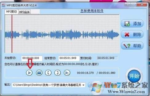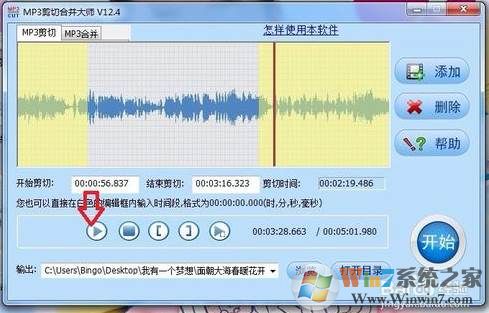 8、再次點(diǎn)擊三角形狀“開(kāi)始”按鈕,如圖箭頭所示,試聽(tīng)一遍是否達(dá)到預(yù)期,如需調(diào)整還可重新設(shè)定,如果滿意則繼續(xù)進(jìn)行下一步
