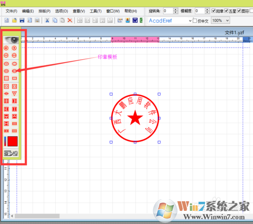 2、界面的左邊是印章的模板,點擊一個圓形印章,拖動到空白工作區(qū)。