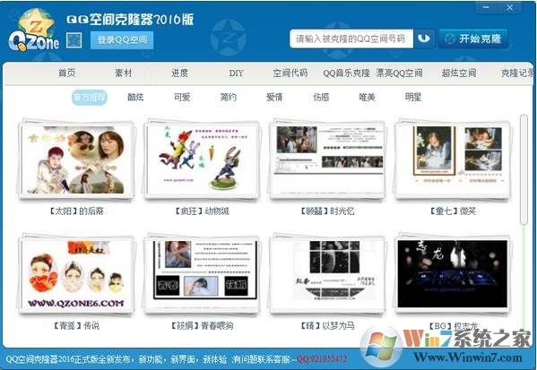 4、如果你沒有克隆素材的話,也不用著急,在首頁內(nèi)有眾多的QQ賬號可供你選擇,如果你向自主選擇克隆素材,一樣可以!在素材辦款內(nèi)提供了最新、最熱門的空間克隆素材可供你自由選擇!還沒完哦,在進度選項你還可以查看克隆的進度,自由按安排自己的時間,是不是酷斃了?。。?/p>