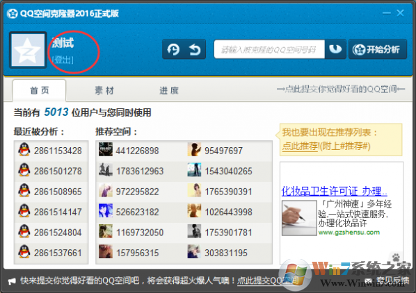 3、完成軟件的登陸后,輸入需要克隆的QQ空間賬號,實現(xiàn)一鍵克隆。