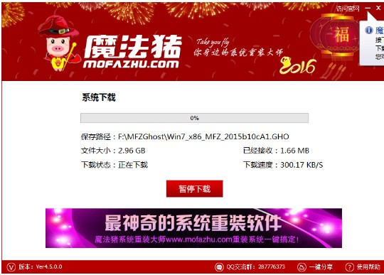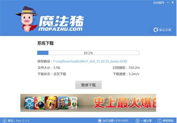 3.接著魔法豬系統(tǒng)重裝大師會(huì)自動(dòng)進(jìn)行系統(tǒng)下載,根據(jù)網(wǎng)速不同下載完成的速度也不同,Win7系統(tǒng)一般在1小時(shí)內(nèi)完成下載。