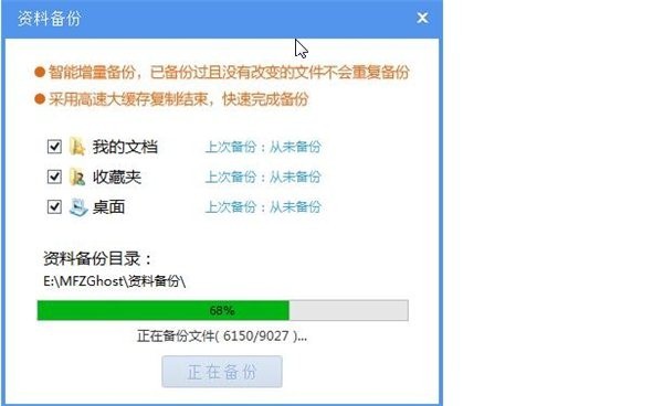 2.接著魔法豬會(huì)對(duì)您系統(tǒng)盤(pán)中的(一般系統(tǒng)盤(pán)為C盤(pán))我的文檔、收藏夾和桌面資料進(jìn)行備份。備份的文件將會(huì)自動(dòng)保存到您系統(tǒng)磁盤(pán)最大的分區(qū)中,名稱(chēng)為X:\MFZGhost\資料備份文件夾中。在下面的進(jìn)度條中可以看到備份的進(jìn)度,一般備份在1-2分鐘之內(nèi)就可以完成。完成后會(huì)自動(dòng)進(jìn)入下一步。