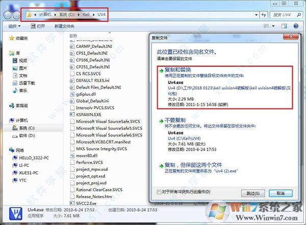 我們先漢化,這樣后面更好破解,將安裝包內(nèi)“漢化包”文件夾下的兩個文件,復(fù)制到軟件的安裝目錄,將原文件替換,默認的安裝目錄為:C:\Keil\UV4。