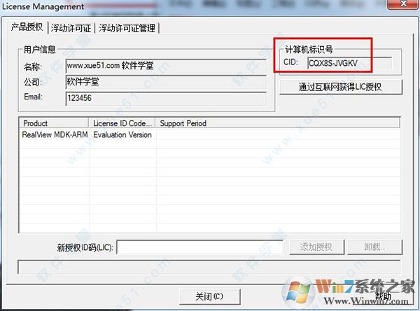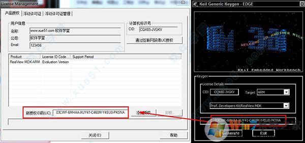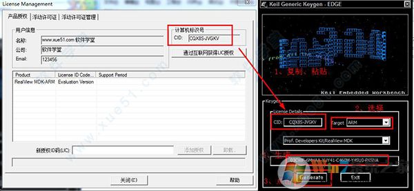 3、打開安裝包內(nèi)“注冊機”文件夾下面的“KEIL_Lic.exe”注冊機,將那個cid復(fù)制復(fù)制到注冊機內(nèi),target選擇“ARM”,然后點擊“Generate”就會生成一串授權(quán)碼。