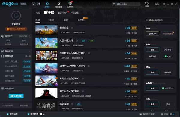 Gogo游戲平臺是一款轉(zhuǎn)為游戲玩家定制的游戲折扣平臺,在這里購買超劃算的正版游戲!它提供了3A大作試玩、購買特惠折扣、游戲回收、免費(fèi)動態(tài)壁紙,游戲網(wǎng)絡(luò)環(huán)境加速等綜合服務(wù)的應(yīng)用,如果你想以比較優(yōu)惠的價格購買游戲,那么Gogo游戲是不錯的選擇。
