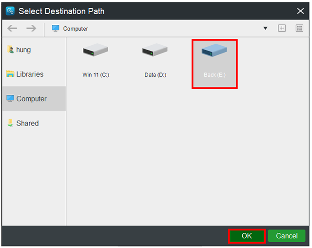 3、然后在彈出窗口中,您會(huì)看到計(jì)算機(jī)上的所有分區(qū)都顯示在此處。建議選擇一個(gè)外部硬盤驅(qū)動(dòng)器的一個(gè)分區(qū)作為位置。
