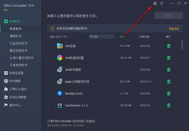 1、當(dāng)我們需要使用到IObit Uninstaller軟件時,那么我們就要將該軟件點擊打開,進入到該軟件的操作頁面中,然后將鼠標(biāo)點擊一下右上角箭頭所指的圖標(biāo)位置進行點擊一下。