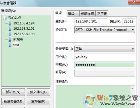 2、在站點管理器界面新建站點,填寫主機、端口,選擇正確的協(xié)議,登錄類型選正常,再填寫用戶名、密碼,再點擊“連接”,見下圖: