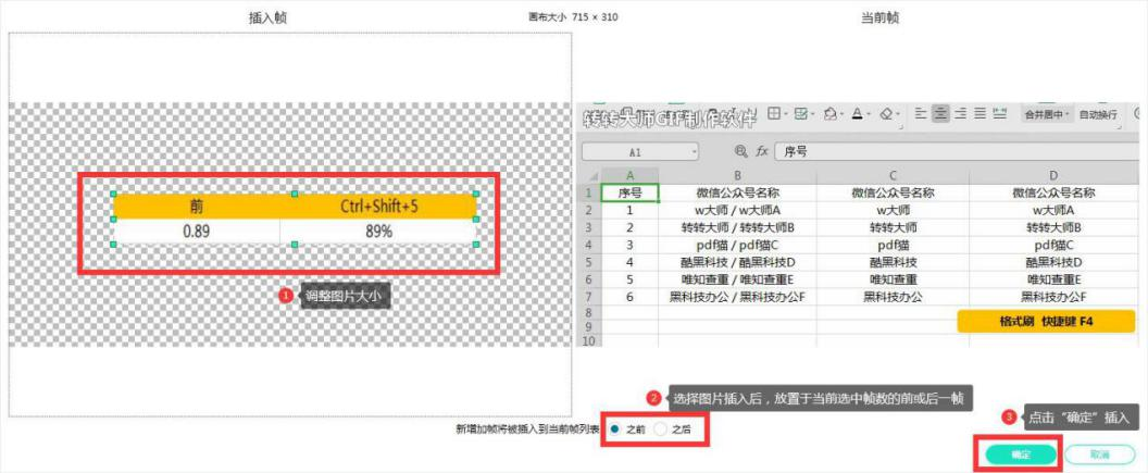 3、選擇需要添加的圖片導(dǎo)入后,從添加圖片設(shè)置彈窗中,設(shè)置圖片的位置(圖片插入的大小按gif第一張圖片的比例為準(zhǔn)),以及添加所在的位置(是在你選擇幀的前一陣或后一幀)。