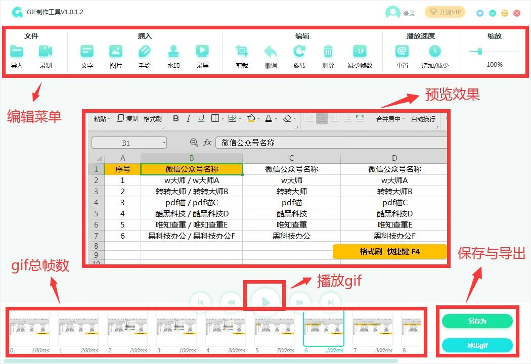 Gif制作工具軟件使用界面分成“編輯菜單按鈕”“效果預(yù)覽”“總幀數(shù)列表”“保存與導(dǎo)出”“播放按鈕”幾個(gè)部分,以下的使用操作說(shuō)明將從這幾個(gè)方面來(lái)講解。