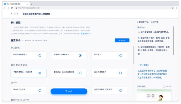 根據(jù)課標知識點,提供模塊化、切片式的教學內(nèi)容。針對不同的教學策略,智能生成一份高質(zhì)量的教學課件和配套教學設計。