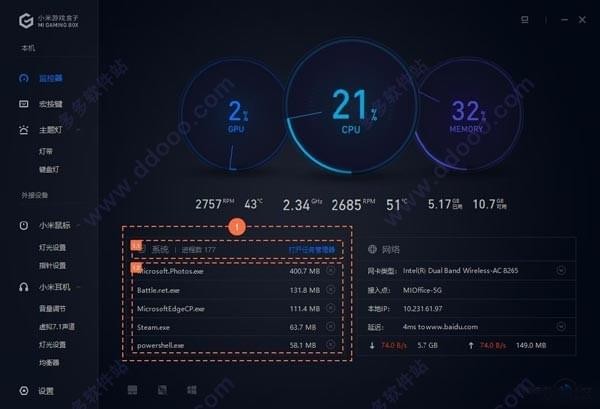 通過清晰的儀表盤,您可以看到筆記本GPU、CPU、內(nèi)存的使用情況與運行情況,一目了然。