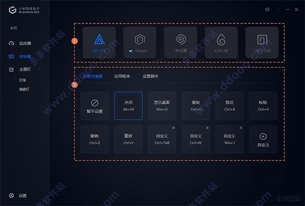 在這里,您可以針對小米游戲本鍵盤左側(cè)的5個宏按鍵進行設(shè)置,定義您希望用到的功能。設(shè)置的范圍包含快捷鍵、應(yīng)用程序、腳本,當(dāng)您綁定按鍵后,您點擊對應(yīng)的實體按鍵,程序?qū)槟鷪?zhí)行對應(yīng)的操作。如果您不不希望綁定按鍵,可以選擇暫不不設(shè)置。