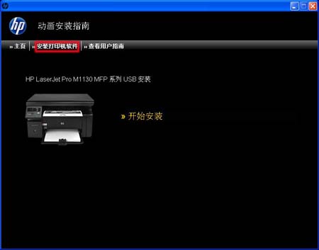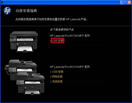 2.在“動(dòng)畫入門指南”窗口中,請(qǐng)?jiān)?ldquo;HP LaserJet Pro M1130 MFP 系列”下,點(diǎn)擊“USB 安裝”按鈕。如圖USB 安裝所示: