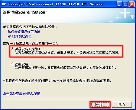 4.在“選擇簡(jiǎn)易安裝或高級(jí)安裝”窗口中,點(diǎn)擊“簡(jiǎn)易安裝(推薦)”項(xiàng),然后點(diǎn)擊“下一步”按鈕。如圖簡(jiǎn)易安裝所示: