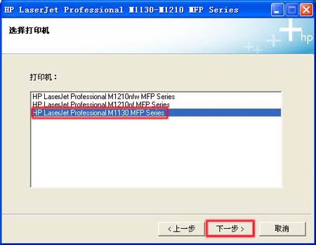 5.在“選擇打印機(jī)”窗口中,選擇“HP LaserJet Professional M1130 MFP Series”項(xiàng),然后點(diǎn)擊“下一步”按鈕。如圖選擇打印機(jī)所示: