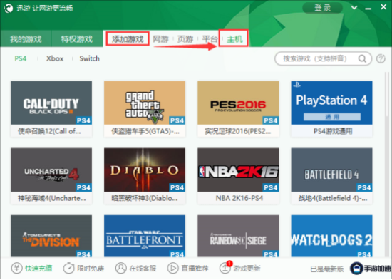 1、添加游戲選擇主機(jī)類標(biāo)簽 自行搜索加速游戲。(如果沒有支持的游戲,可以選「PS4游戲通用」或者「Xbox游戲通用」或者「switch游戲通用」)