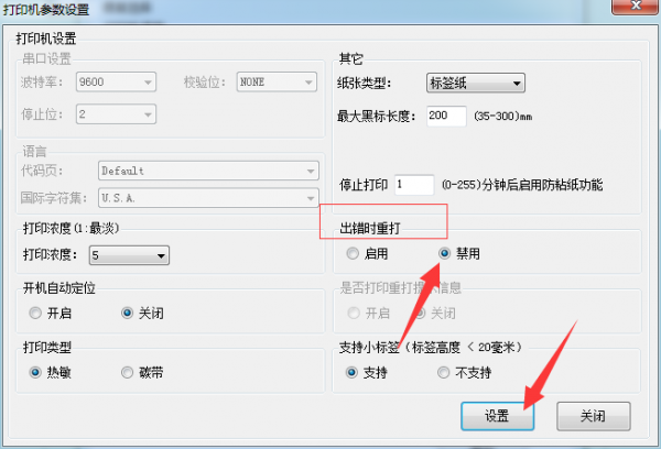 5、在對(duì)話框中找到“出錯(cuò)時(shí)重打”,選擇下面的“禁用”單選鈕,點(diǎn)擊“設(shè)置”,這樣關(guān)閉重復(fù)打印。