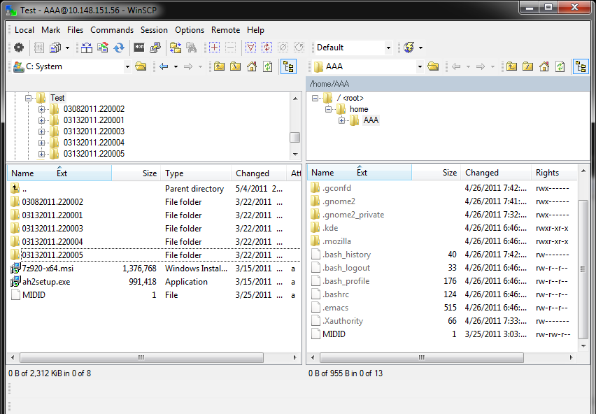 2、輸入密碼后打開WinSCP的窗口,如下: (此時(shí)已經(jīng)可以進(jìn)行文件的copy,delete,rename,folder sync等操作了)