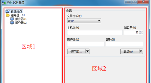4、首先介紹站點(diǎn)的保存,在主界面“區(qū)域1”中,用于新建的站點(diǎn)配置和保存站點(diǎn)的顯示。即點(diǎn)擊“新建站點(diǎn)”,在“區(qū)域2”中配置文件協(xié)議、主機(jī)名、端口號(hào)、用戶名、密碼,保存后在“區(qū)域1”中顯示。具體操作如下: