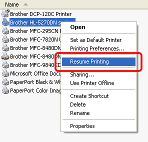 右擊您Brother設(shè)備的圖標(biāo)并選擇繼續(xù)打印(Resume Printing)。(如果菜單顯示暫停打印(Pause Printing), 那么打印機(jī)狀態(tài)沒(méi)有問(wèn)題。)
