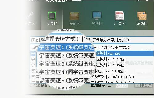 點擊"功能區(qū)",選擇自己計算機系統(tǒng)對應的變速方式,(部分特殊程序或游戲則選擇字母項特殊變速方式).等待加速火箭發(fā)射成功.
