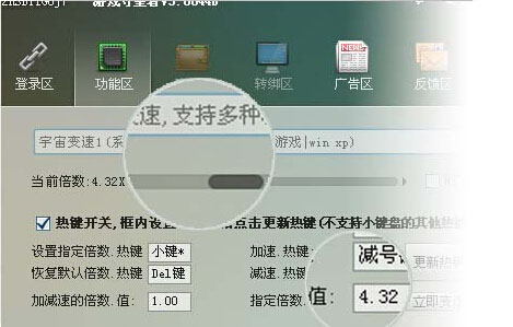 3.增加幾種特殊的變速方式,變速齒輪型/內存變速型/隱藏變速型等,目前由于部分網絡游戲有提速器的檢測模塊,有時會提示"游戲環(huán)境異常","非法模塊","發(fā)現(xiàn)提速器","Hackspeed",等,這時您可以更換使用b版本新增加的字母開頭的變速方式即可屏蔽絕大部分提示(僅供測試之用,請勿用于作弊或其他非法用途).
