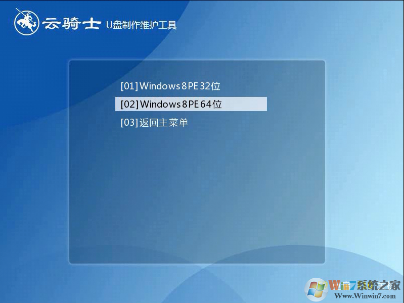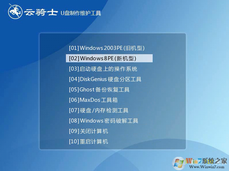 9、系統(tǒng)啟動后會進(jìn)入云騎士PE界面,新機(jī)型選擇Windows8 PE,老機(jī)型可以選擇Windows 2003 PE,選擇完畢后回車進(jìn)入。