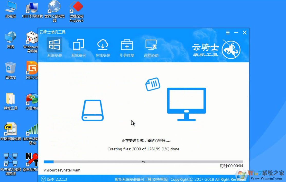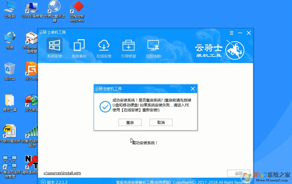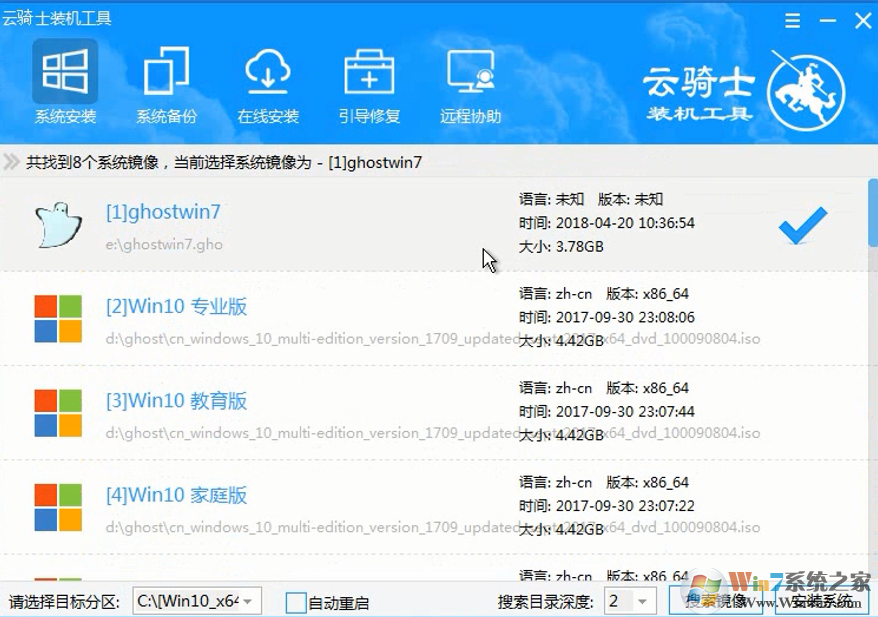 11、進(jìn)入PE系統(tǒng)之后會自動打開云騎士PE安裝工具,勾選剛下載好的win7系統(tǒng),最后點(diǎn)擊安裝系統(tǒng)。