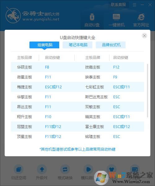 7、接著用新做好的U盤啟動盤來裝win7系統(tǒng),將U盤插在新電腦的USB接口,開機(jī)并不斷按下啟動U盤快捷鍵,U盤快捷鍵可以通過云騎士裝機(jī)大師確認(rèn)。