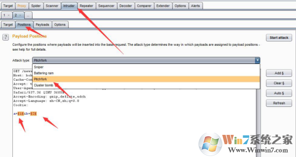 之后也會出現(xiàn)Intruder變黃色。還是跟重放一樣,進(jìn)去爆破功能模塊。