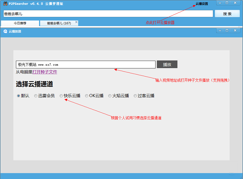 1、云播放器設(shè)置,可直接打開資源鏈接、種子文件,支持選擇云播通道,點(diǎn)擊軟件右上角“云播設(shè)置”,打開云播放器窗口