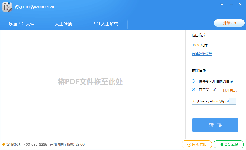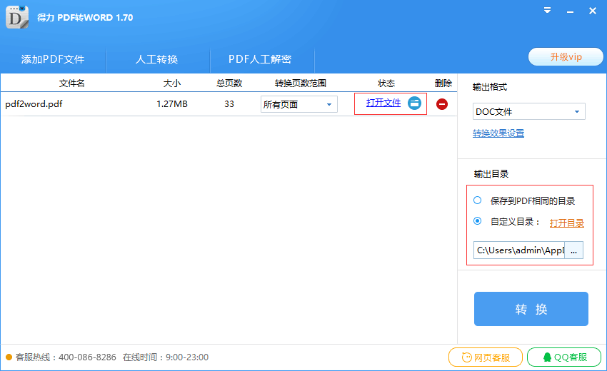 打開文件后,設(shè)置轉(zhuǎn)換輸出格式默認(rèn)原生doc,點擊“轉(zhuǎn)換” (如果文件超過5頁,需要升級VIP版本)