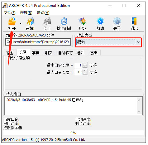 2、打開需要破解密碼的文件程序,或直接將壓縮包拖至軟件上方打開,選擇 “暴力破解”。