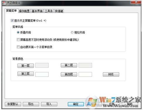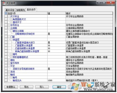 通過【自定義】和【天正選項(xiàng)】可以進(jìn)行軟件界面形式及操作命令方面、建筑設(shè)計(jì)參數(shù)方面的定制設(shè)置。此設(shè)置可以導(dǎo)出成XML文件,供貴單位其他用戶導(dǎo)入,實(shí)現(xiàn)參數(shù)配置的共享,也可通過“恢復(fù)默認(rèn)”恢復(fù)程序最初設(shè)置值。