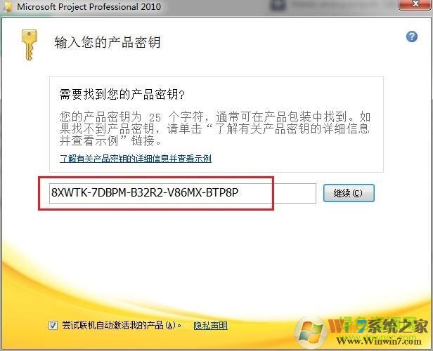 2.會提示要您輸入產(chǎn)品密鑰(如下圖),輸入小編下放提供的project 2010密鑰(這里以8XWTK-7DBPM-B32R2-V86MX-BTP8P為例子)。