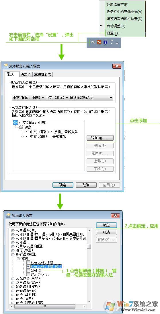 c、然后在打開的小窗口中,選擇朝鮮語(韓國),下方鍵盤勾選安裝好的“Microsoft IME 2010”,點擊確定;