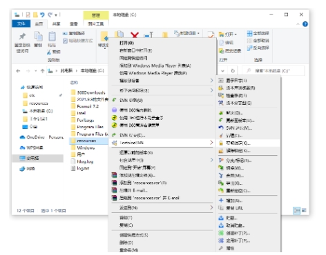 基于Windows Shell擴(kuò)展技術(shù),TortoiseSVN將版本管理功能深度整合至資源管理器,使用者可直接通過(guò)文件/文件夾右鍵菜單執(zhí)行各項(xiàng)操作。該右鍵菜單兼容多數(shù)文件管理工具及常規(guī)Windows應(yīng)用。