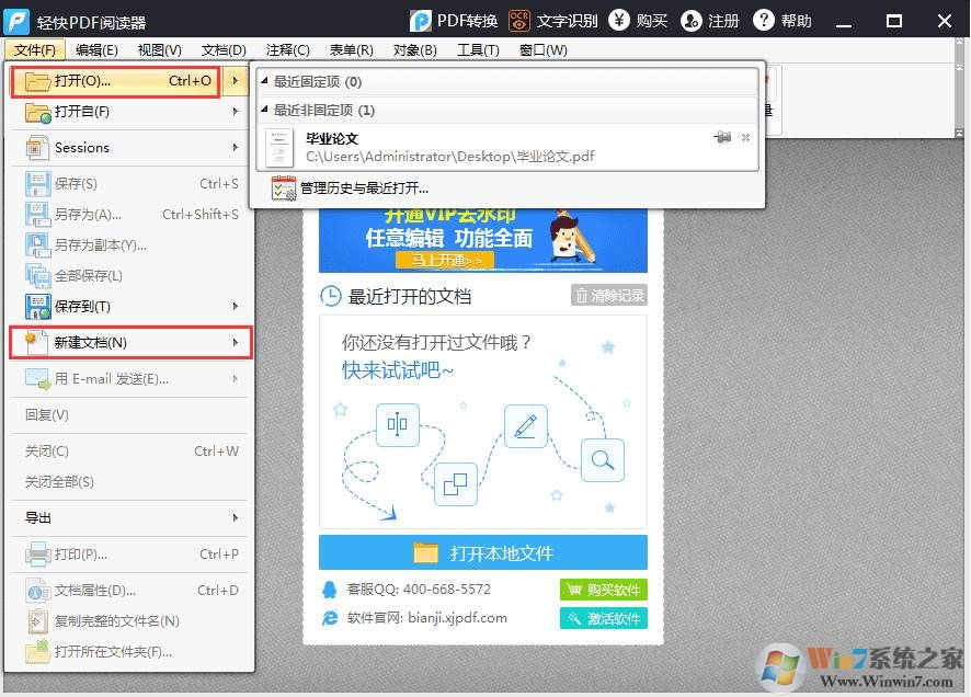 “文件”——“打開”,選擇電腦中的PDF文件,即可打開PDF文件進(jìn)行閱讀。除此之外,還可以通過“新建文檔”按鈕,創(chuàng)建一個(gè)新的空白PDF文件。(打開PDF文件,還有更快捷的方法:直接拖拽電腦中的PDF文件至軟件界面中即可打開閱讀。)