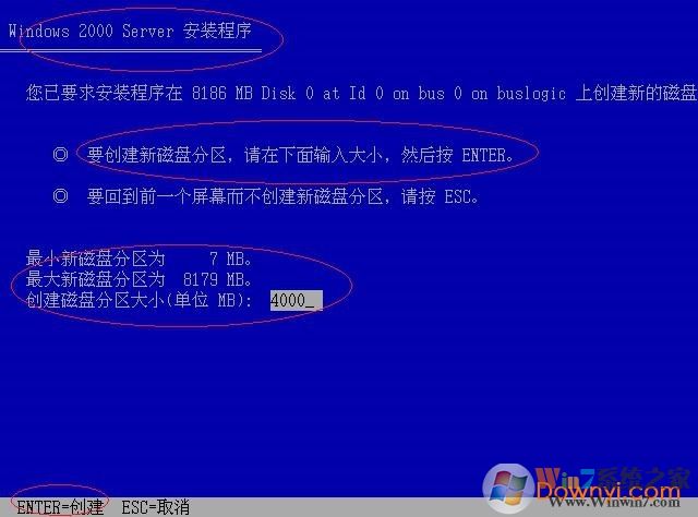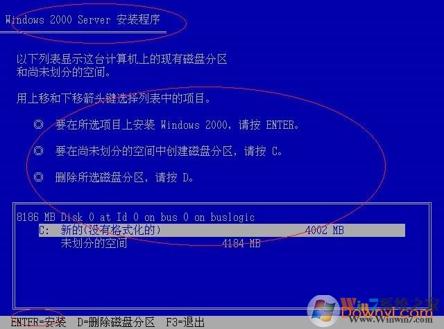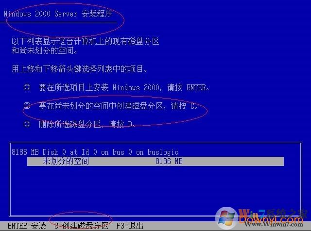 第二步 如圖所示,計(jì)算機(jī)現(xiàn)有磁盤分區(qū)和尚未劃分的空間。點(diǎn)擊"c"鍵,要在尚未劃分的空間中創(chuàng)建磁盤分區(qū)。