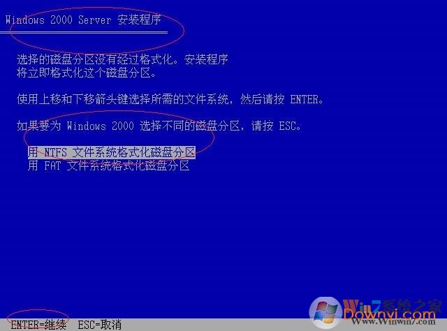 第三步 選擇的磁盤分區(qū)沒(méi)有經(jīng)過(guò)格式化,如圖所示。選擇"用ntfs文件系統(tǒng)格式化磁盤分區(qū)",按回車鍵確認(rèn)。